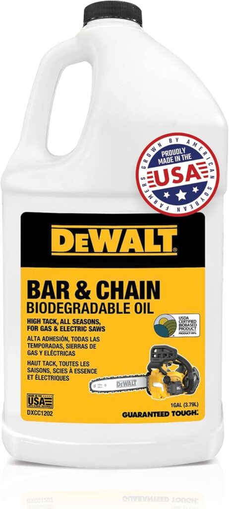 This is a DEWALT chain and bar oil designed for chainsaws. It reduces friction and heat while cutting. Because it is biodegradable, it breaks down naturally and does not harm soil or plants if it drips. The oil is formulated to stick to the chain and not fling off easily, so it keeps lubrication steady while sawing.